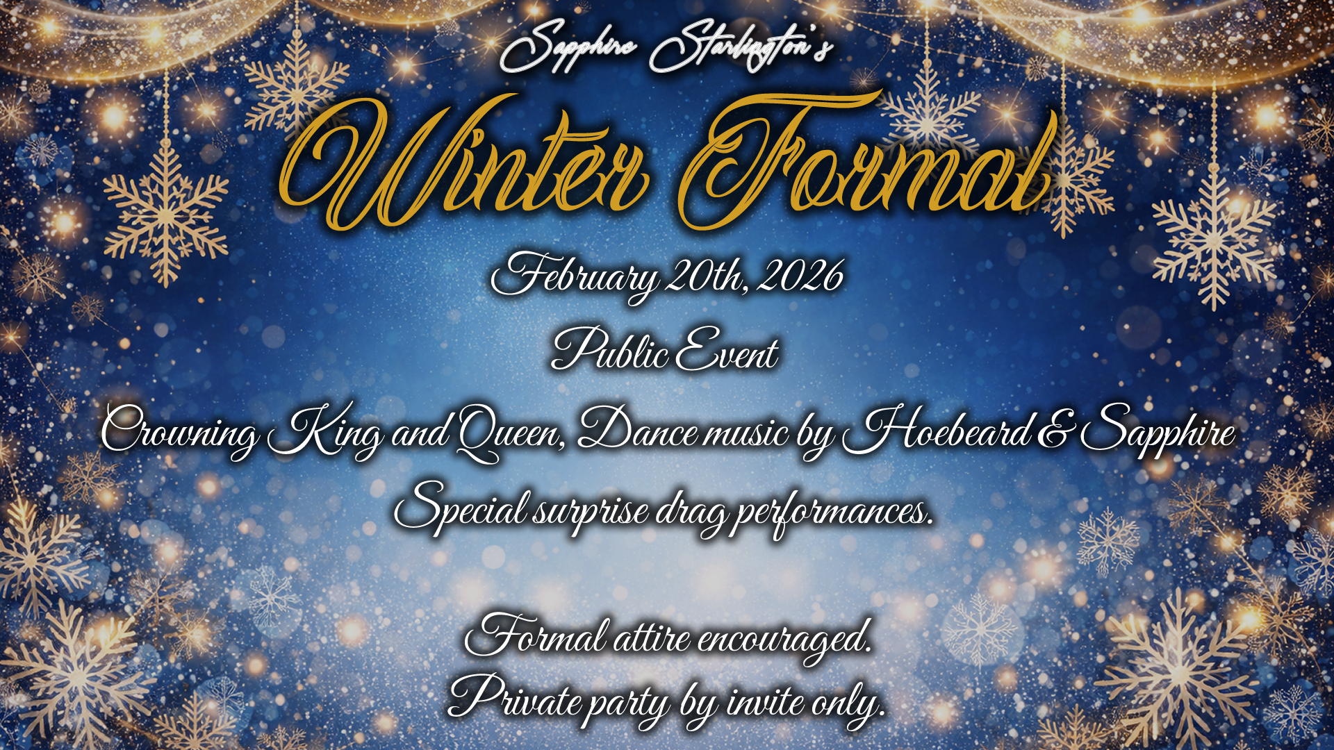Step into an elegant Winter Formal celebration featuring a public event open to all, alongside an exclusive, invite-only VIP lounge experience. Formal attire is required for entry into the VIP area, which offers access to a private bar, complimentary hors d’oeuvres, and exclusive menu pricing. VIP admission is limited and requires a special invitation for access. Guests can enjoy an unforgettable evening of music, performances, and celebration in a refined, festive atmosphere.