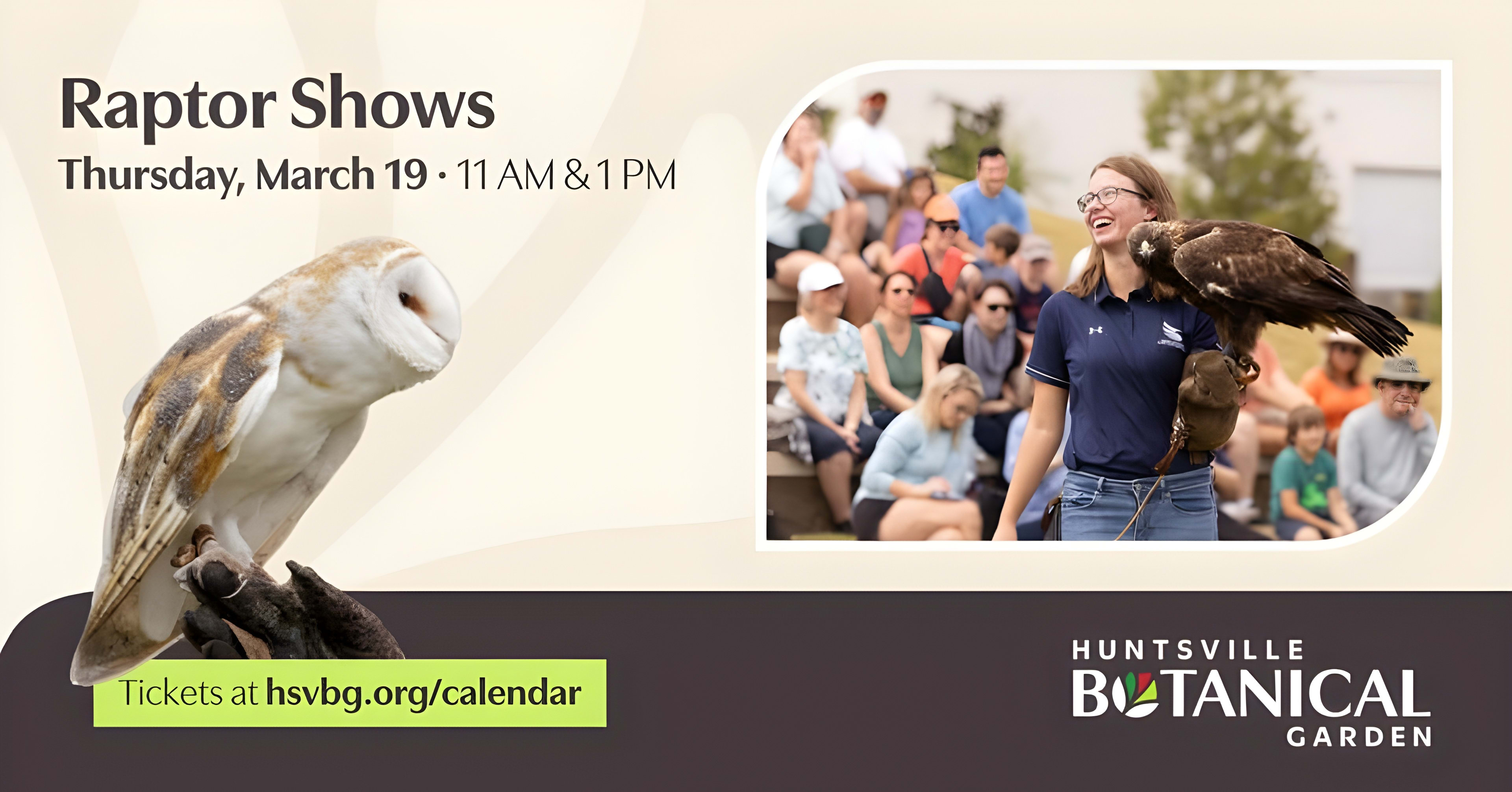 Be awed by the beauty and power of nature’s most remarkable hunters at Huntsville Botanical Garden! Join us for an unforgettable Raptor Show, presented by the Auburn University Raptor Center, as incredible birds of prey take center stage in our Amphitheatre.
